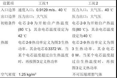 在工況1(電池按額定功率持續(xù)運(yùn)行)、工況2(電池系統(tǒng)停止工作,空調(diào)機(jī)組停運(yùn))這兩種工況時(shí)熱失控后對(duì)其余電芯影響最大。使用Fluent軟件及其DO輻射傳熱模型進(jìn)行仿真計(jì)算,電芯表面與空氣進(jìn)行共軛傳熱(couple邊界),熱失控電芯生熱速率通過(guò)自定義函數(shù)(UDF)定義,其余相關(guān)設(shè)置見(jiàn)表1。