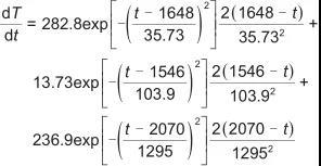 如圖2所示,擬合的函數(shù)曲線與提取值吻合較好。對(duì)擬合的溫度函數(shù)式(2)求導(dǎo)得到式(3)