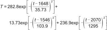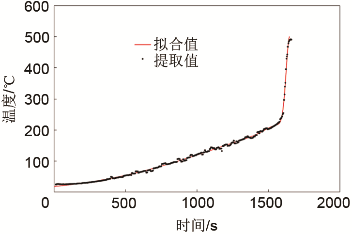 絕熱測(cè)試中,當(dāng)電池溫度達(dá)到最高值以后不再生熱,溫度降低,計(jì)算熱失控生熱功率時(shí)只需考慮從自產(chǎn)熱到溫度最高這個(gè)過(guò)程。因此通過(guò)MATLAB編程提取了圖1中100% SOC電池?zé)崾Э販囟冗_(dá)到最高值前的數(shù)據(jù)。再將提取的離散點(diǎn)通過(guò)高斯函數(shù)擬合,擬合函數(shù)見(jiàn)式(2),函數(shù)曲線見(jiàn)圖2。