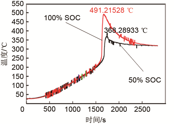 對(duì)于磷酸鐵鋰電池T1為80~160 ℃,T2為150~250 ℃,單體絕熱環(huán)境熱失控以后的最高溫度大都不超過(guò)500 ℃,圖1為某磷酸鐵鋰電池?zé)崾Э販囟惹€[8]。