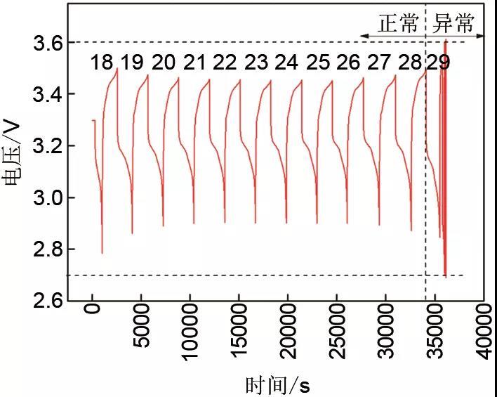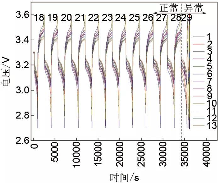 電池包在前2次測試中可以正常充、放電,在第3次測試后期不能充、放電。如圖2所示,在電池包第3次測試中各模組循環(huán)充、放電電壓曲線中,第29次充電后電壓曲線出現(xiàn)異常,由于電池包中的模組在短時(shí)間內(nèi)達(dá)到充電截止電壓和放電截止電壓,導(dǎo)致電池包不能正常充、放電。因此,選取電池包前28次的充電數(shù)據(jù)進(jìn)行分析,在28次充電數(shù)據(jù)中根據(jù)數(shù)據(jù)選取原則(1)~(3),選取符合的充電數(shù)據(jù)。