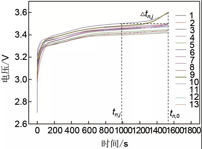 在電池包實(shí)際充電過程中,是無法對某一單體單獨(dú)充電的,因而充電結(jié)束時(shí)未達(dá)到充電截止電壓單體的準(zhǔn)確剩余充電時(shí)間是無法得到的,但是可通過最先達(dá)到充電截止電壓單體的電壓曲線為基準(zhǔn)獲取。在圖1中,以最先達(dá)到截止電壓的6號單體的充電電壓曲線為基準(zhǔn),通過電池包中其他單體充電結(jié)束時(shí)的電壓和基準(zhǔn)充電電壓曲線,可計(jì)算得到相對充電時(shí)間Δtn,j,表征該單體的剩余充電時(shí)間,計(jì)算公式為