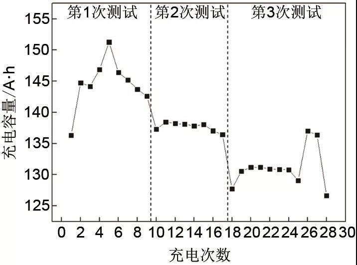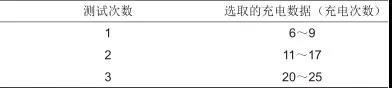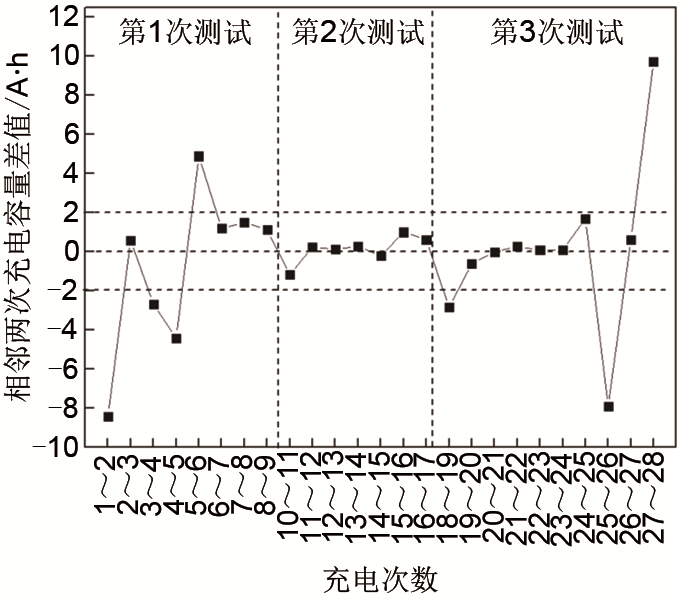 圖3為電池包在3次測試中每次充電容量,根據(jù)每次充電容量計(jì)算每次充電容量與后一次充電容量差值ΔC。3次測試中的充電容量差值曲線如圖4所示,縱坐標(biāo)為相鄰兩次充電容量差值,橫坐標(biāo)為對應(yīng)的相鄰兩次充電次數(shù)。在3次測試中,后2次測試過程中充電容量數(shù)值變化較小,ΔC基本保持在±2 A·h內(nèi)。以-2 A·h≤ΔC≤2 A·h為充電數(shù)據(jù)選取條件,并結(jié)合圖3和圖4,選取測試1中的第2、3、6~9次充電數(shù)據(jù)、測試2中的所有數(shù)據(jù)以及測試3中的第19~25、27次充電數(shù)據(jù)。