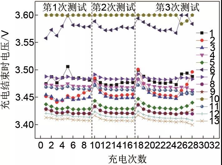 根據(jù)鋰電池的微短路特性,在電池包中沒有單體發(fā)生微短路時(shí),每次充電過程中未最先達(dá)到截至止電壓的各單體相對充電時(shí)間基本不變;電池包中有單體發(fā)生微短路時(shí),相比于其他未發(fā)生微短路的正常單體,該單體的相對充電時(shí)間隨著充電次數(shù)的增加而不斷延長。