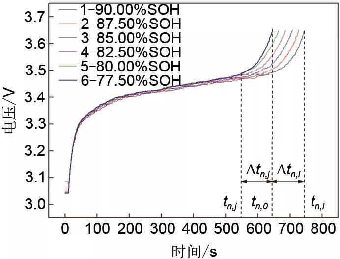 如圖1所示,其中6條電壓曲線為同一18650磷酸鐵鋰單體電池在不同SOH下的充電電壓曲線,其額定容量為1 A·h、額定電壓為3.3 V、充電截止電壓為3.65 V。將圖1中的6條充電電壓曲線模擬為1個(gè)電池包在某次充電的電壓曲線,該電池包由6個(gè)單體串聯(lián)而成,分別用1~6為其編號。