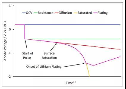 引起電壓突變的一個過程是電解質(zhì)的耗竭。在高倍率放電時,正極的嵌鋰可以消耗正極粒子周圍電解液中所有的鋰離子,導致離子導電性下降,進而導致電極電壓下降。在高倍率充電時,同樣的情況也會發(fā)生在負極上。如果顆粒上的脫鋰電流比離子擴散通量快,那么顆粒表面的濃度減小甚至達到零。前面所述,GITT模型中使用的邊界條件是,電流與表面濃度梯度成比例。當正極表面濃度為零時,梯度減小,電壓不再沿t0.5線移動;在高倍率鋰化過程中,表面鋰濃度可以上升到100%,此時濃度梯度再次減小。鋰在負極表面的沉積通常被認為是一個成核和生長過程,即需一個能壘來形成一個夠大的穩(wěn)定的核,然后可以更容易地生長。在這種情況下,負極電壓預(yù)計會先降低后升高。但是在實際情況中,如圖七所示,所有的電壓都直接下降到- 2V截止電位。這顯然表明負極負的電壓不會自動導致鋰電鍍。