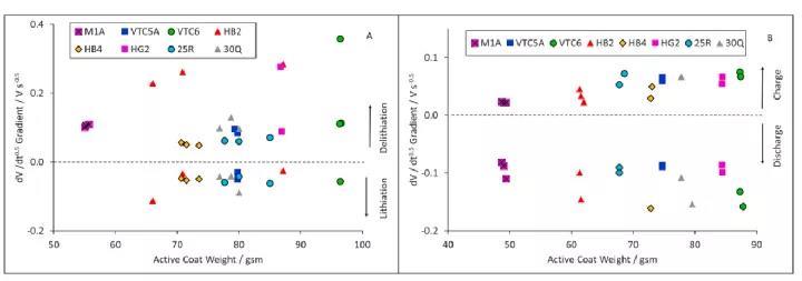 在初始電阻增加后,電極開始受擴散限制;對于擴散受限過程,電極電壓與t0.5成正比,進而可計算有效擴散系數(shù)(梯度)。如果是在固定的充電狀態(tài)下進行,那么梯度(dE/dt0.5)應(yīng)該與電流成比例。電壓與t0.5的線性圖顯示了在±20 脈沖瞬態(tài)線性區(qū)域內(nèi)電壓相對于t0.5的梯度 (不包括48G電池的結(jié)果,其梯度遠高于其他電池)。電壓與t0.5的梯度是從瞬態(tài)的初始線性段計算出來的。與ASI值不同的是,電壓與t0.5的梯度值在脈沖充放電時是不對稱的,對負極來講,鋰化時的梯度值比脫鋰時小;對于正極,充電時的梯度值小于放電時的值。
