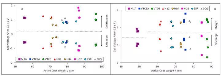 分析充放電速率的一種簡易方法是繪制2C的放電容量與C/5容量的比值。如圖二所示:每種類型的電極至少制成了三個電池來進行測試。這些點的分布表明,涂層重量和功率容量都有變化。這九種負極 (從M1A到48G)的2C/ C/5的容量比隨著涂層重量的增加有明顯的線性趨勢。擁有高功率: 能量比的電池通常具有較低的面積比容量,這與較低的涂層質(zhì)量有關(guān)。三星48G電池具有最大的能量密度,因此有最高的涂層質(zhì)量,和最差的2C快充性能。正極也展現(xiàn)了類似的2 C: C/5容量比與活性涂層質(zhì)量的關(guān)系:48G正極具有迄最高的涂層重量??傮w而言,正極的2C: C/5比值要比負極的低。
