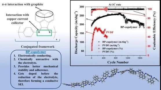 與傳統(tǒng)的PVDF粘合劑相比,BP粘合劑可為負極提供更好的粘合性和機械穩(wěn)定性。其次,BP共聚物相比PVD更具導(dǎo)電性,并可產(chǎn)生一個更薄、且電阻更小的導(dǎo)電固體電解質(zhì)界面。同時BP共聚物不容易與電解質(zhì)發(fā)生反應(yīng),大大避免降解。