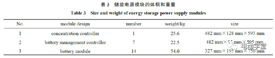 儲能電池單元采用三種類型的模塊化設(shè)計:集中控制箱、充電與高壓控制機(jī)箱和儲能電池機(jī)箱,體積和重量如表3所示,機(jī)箱均采用插箱方式,在現(xiàn)場對維修性進(jìn)行了測試,滿足基層級平均修復(fù)時間(MTTR)不大于30min。