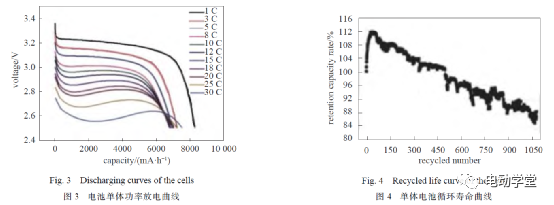 電池單體放電曲線如圖3所示,電芯單體在30C放電情況下,仍能放出7.5A·h以上的容量,表現(xiàn)出良好的功率特性。