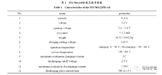 考慮到項目進(jìn)度和可靠性的要求,必須選擇已經(jīng)大量應(yīng)用的定型電產(chǎn)品芯,根據(jù)設(shè)計選擇容量8A·h方形鋁殼電芯,型號IFP1780123PB磷酸鐵鋰電芯,主要性能參數(shù)表1。