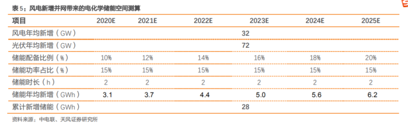 在能源結(jié)構(gòu)轉(zhuǎn)型,新能源裝機(jī)高增,各地政府要求配置儲能的背景下,我們對我國新能源并網(wǎng)帶來的儲能空間進(jìn)行測算。預(yù)計 2020-2025 年間,風(fēng)電、光伏并網(wǎng)帶來的新增儲能需求合計為 28GWh,年均新增儲能需求為 4.7GWh。測算假設(shè):①新增裝機(jī):根據(jù)表 3 的測算結(jié)果,假定 2020-2025 年,風(fēng)電光伏新增裝機(jī)呈線性增長,每年合計新增裝機(jī)規(guī)模 104GW;②儲能配比率:從 2020 年各地要求的儲能配比率來看,最低配比要求 5%,最高配比要求 20%。我們假定 2020 年實現(xiàn)配比率 10%,以后每年配比率逐漸上升 2pct,至 2025 年實現(xiàn)配比率 20%;③儲能功率占比:根據(jù)現(xiàn)有儲能項目功率配比情況,假設(shè)為 15%;④儲能時長:按 2h 的平均備電時長作為估算值。