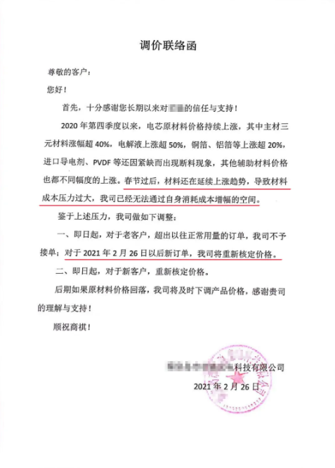 在原材料價(jià)格上漲以及市場(chǎng)需求大增的影響下,鋰電池廠家肩負(fù)重大壓力,日前就有廠家發(fā)布了最新的調(diào)價(jià)通知:春節(jié)后,鋰電池原材料價(jià)格持續(xù)上漲,導(dǎo)致材料成本壓力過大,企業(yè)無法通過自身消耗成本增幅的空間。針對(duì)26日后的新訂單,將重新調(diào)整價(jià)格!