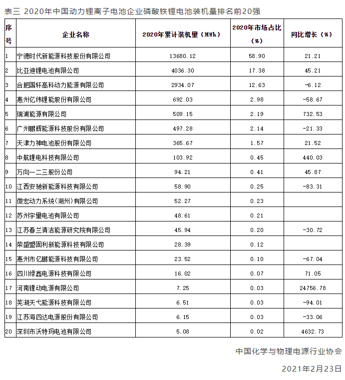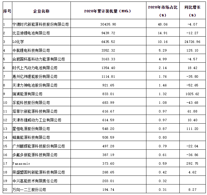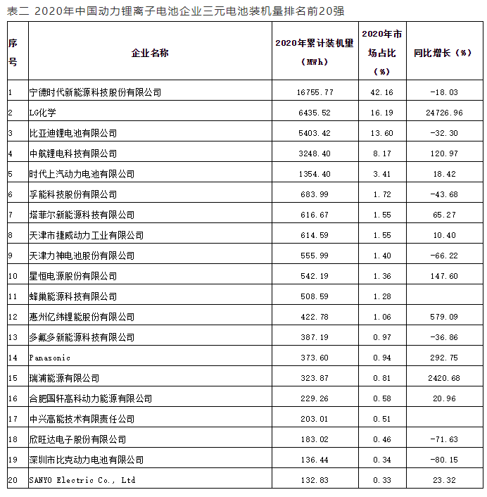 表一 2020年中國動力鋰離子電池企業(yè)裝機量排名前20強