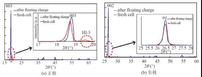 圖8 浮充前后正負(fù)極材料XRD對(duì)比