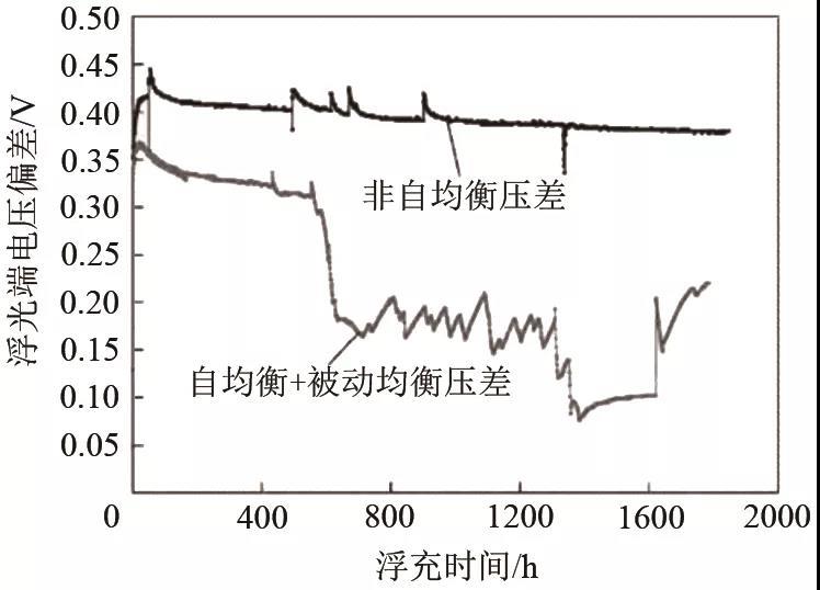 Wei等研究了磷酸鐵鋰電池組的浮充特性,電池單體的浮充電壓限定在3.65 V,在25 ℃的常溫下浮充一年,期間對(duì)電池的電壓、內(nèi)阻和容量進(jìn)行測(cè)量。試驗(yàn)結(jié)果表明,電池組的容量保持在97%,其中由于電池單體之間的不一致性,出現(xiàn)個(gè)別電池電壓異常,浮充后電池老化加快??傮w來說,94%的電池電壓穩(wěn)定,電池的內(nèi)阻沒有很大變化。王立強(qiáng)等對(duì)軌道交通鈦酸鋰電池展開不一致性研究,在不同荷電狀態(tài)下擱置一年后對(duì)電池模塊內(nèi)單體的電壓、內(nèi)阻和容量等參數(shù)進(jìn)行測(cè)試。測(cè)試結(jié)果表明,其單體間的不一致性主要為電壓的差異;同時(shí)采用容量增量法對(duì)鈦酸鋰電池在浮充擱置下性能變化進(jìn)行分析,發(fā)現(xiàn)電池間自放電的差異,使得初始SOC的不同,導(dǎo)致同一模塊內(nèi)充入電量不同,在長(zhǎng)期浮充下不一致性問題加劇,影響電池壽命。郭光朝等研究了單體電池電壓不一致性對(duì)電池系統(tǒng)容量衰減的影響,通過200 kW/200 kW·h鋰電池儲(chǔ)能系統(tǒng)和250 kW/1 MW·h鋰電池儲(chǔ)能系統(tǒng)在不同時(shí)間做容量標(biāo)定試驗(yàn)。系統(tǒng)在25 ℃浮充兩年后,發(fā)現(xiàn)250 kW/1 MW·h鋰電池儲(chǔ)能系統(tǒng)充電性能只衰減了4.24%,放電性能只衰減了2.6%,同時(shí)發(fā)現(xiàn)電池單體電壓一致性較好,最大電壓差僅為0.350 V。然而200 kW/200 kW·h鋰電池儲(chǔ)能系統(tǒng)充電性能衰減了25.976%,放電性能衰減了27.120%。由于250 kW/1 MW·h鋰電池儲(chǔ)能系統(tǒng)具有充放電均衡控制策略,可以改善系統(tǒng)內(nèi)單體電壓的不一致性,大幅度減少儲(chǔ)能電池容量衰減。就此提出運(yùn)用外部均衡控制策略,以提高浮充下儲(chǔ)能電池的容量保持率,增加循環(huán)壽命。