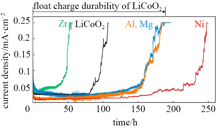 Hirooka等以鈷酸鋰電池為對(duì)象,研究了不同金屬取代鋰鈷氧化物的高壓浮充耐久性試驗(yàn),金屬包括Co、Ni、Al、Mg和Zr,在4.5 V和60 ℃的條件下進(jìn)行浮充。試驗(yàn)結(jié)果如圖6所示,通過電流增加至0.25 mA/cm2的時(shí)間來定量定義浮充耐久性。材料的浮充耐久性隨取代金屬離子的不同而變化,順序?yàn)殒?gt;鋁>鎂>鈷>鋯,當(dāng)鎳以5%的量代替鋰鈷氧化物時(shí),與鈷酸鋰相比,浮充電耐久性提高了4倍以上,而能量密度沒有降低。