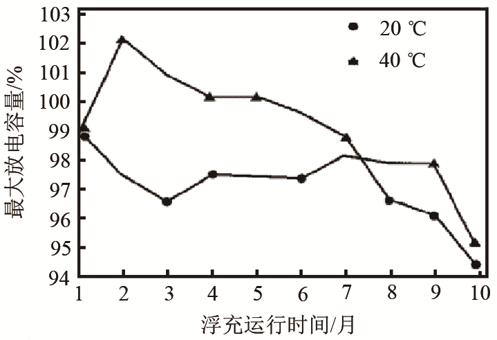 齊明輝等以單體額定容量為7.8 A·h的FBL磷酸鐵鋰電池為研究對(duì)象,在額定電壓為3.6 V下,進(jìn)行不同溫度的浮充電容量測(cè)試實(shí)驗(yàn),結(jié)果如圖3、圖4所示。發(fā)現(xiàn)溫度低于0 ℃時(shí),放電容量衰減迅速;溫度低于常溫進(jìn)行浮充時(shí),容量衰減速度加快,電池使用壽命縮短。隨著溫度升高,放電容量逐漸恢復(fù);但是當(dāng)溫度高于40 ℃后,電池會(huì)出現(xiàn)過放現(xiàn)象。同時(shí)在20 ℃和40 ℃的不同溫度下進(jìn)行浮充電時(shí)容量衰減速度也有差異,其在不同溫度下容量衰減的參照組設(shè)置較少。