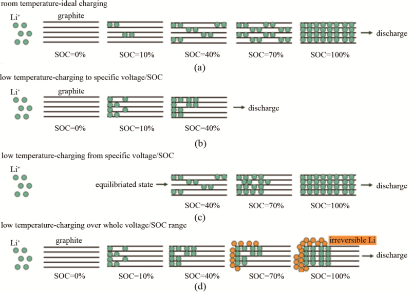 在常溫充電下,鋰離子可以均勻嵌入負(fù)極之中;而在溫度低于0 ℃情況下,鋰離子更多地嵌入在碳負(fù)極的表面,沒有到達(dá)較為深層的部分,使得鋰離子持續(xù)在負(fù)極表面沉積,逐漸形成鋰枝晶,引起電池容量衰減,甚至導(dǎo)致電池內(nèi)短路的發(fā)生,使得電池安全性降低。