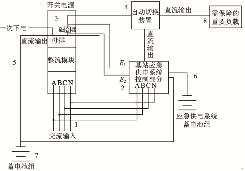 目前常見的充電方法為恒流充電、恒壓充電、恒流恒壓充電和脈沖充電4種。浮充電是一種特殊的脈沖充電方式。在電池充電的末期以一種持續(xù)的、長(zhǎng)時(shí)間的模式,用小電流來緩慢增加電池的充電深度,或者補(bǔ)償電池在長(zhǎng)期靜置下的自放電損失,使電池處于電量飽滿狀態(tài)。浮充電也是一種復(fù)雜的充電方式,需要通過精確的控制策略來實(shí)現(xiàn),從而不斷對(duì)儲(chǔ)能電池電量進(jìn)行補(bǔ)充。在儲(chǔ)能電池的管理系統(tǒng)中,主要包括控制系統(tǒng)、切換裝置和后備電池組等,系統(tǒng)模型如圖1所示。