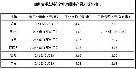 高工鋰電獲悉,目前四川省重點(diǎn)城市在大工業(yè)用電、工業(yè)水價(jià)、工業(yè)起價(jià)等方面均給出了相當(dāng)大的優(yōu)惠力度。其中大工業(yè)用電最優(yōu)惠電價(jià)達(dá)到0.35元/度,相比于東部沿海城市0.6-0.7元/度的工業(yè)用電價(jià)格幾乎便宜了50%。工業(yè)水價(jià)與工業(yè)氣價(jià)均有不同程度價(jià)格優(yōu)勢(shì)。