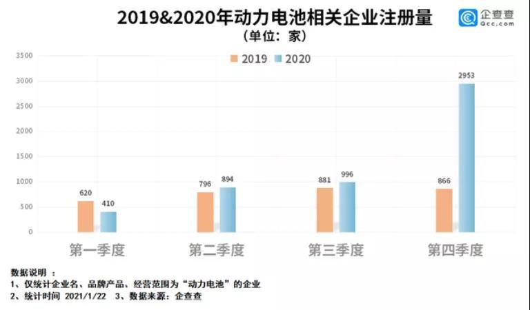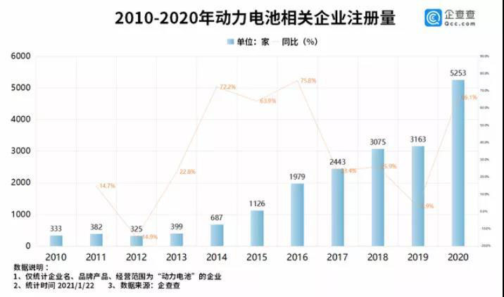 企查查數(shù)據,截至2021年1月,中國動力電池相關企業(yè)1.8萬家,2020全年新增注冊企業(yè)5253家,同比增長66.1%。