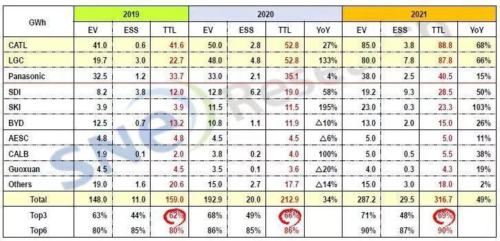 (表中EV即電動車用的動力電池產(chǎn)能,數(shù)據(jù)來自韓國市場調(diào)研機構SNE Research)