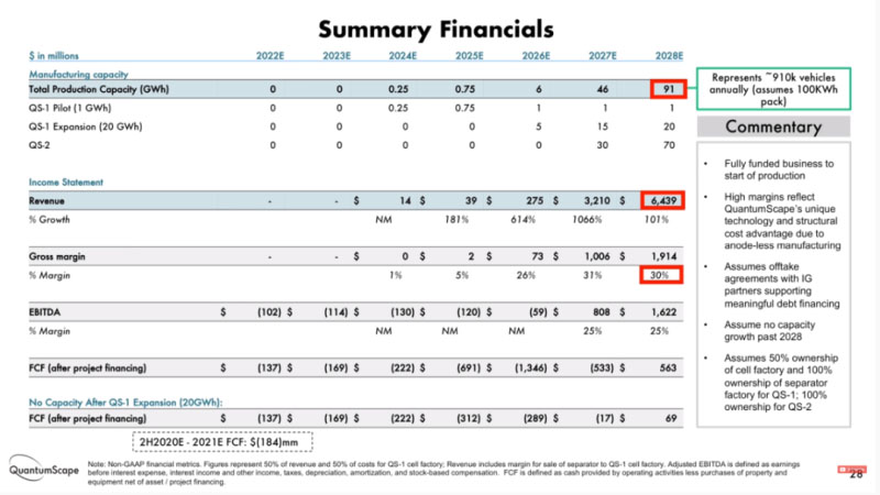 根據(jù)QS在招股書中的預(yù)測,其2028年規(guī)劃產(chǎn)能為91GWh(約等于特斯拉規(guī)劃產(chǎn)能的1/33),營業(yè)額為64.4億美元。