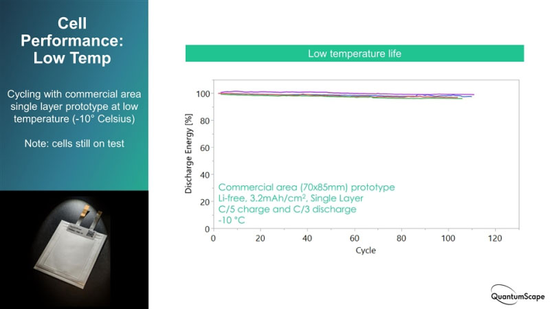 此外,QS還以電池重量比能量的衰減作為對比參數(shù),展示了其單體疊片對極端低溫條件的耐受能力。結(jié)果顯示,在-30℃低溫下,該單體疊片的重量比能量約比0℃條件下衰減30%——與之對應(yīng)的是,傳統(tǒng)鋰離子電池在-25℃下,這一衰減比率達(dá)到50%以上。