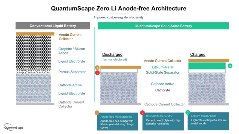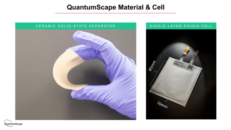 QS開發(fā)的固態(tài)電池技術(shù),使用一種陶瓷材料的固態(tài)隔膜,代替?zhèn)鹘y(tǒng)的液態(tài)電解質(zhì)和多孔隔膜,同時取消了傳統(tǒng)鋰離子電池中的石墨負(fù)極。