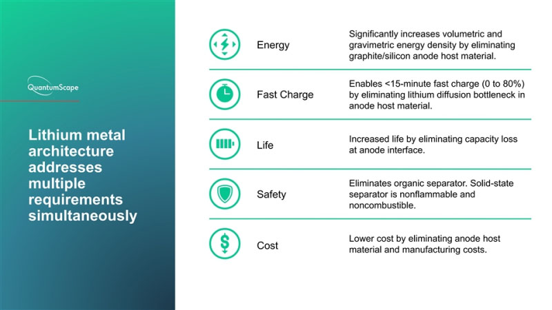 根據(jù)辛格的介紹,QS開發(fā)的鋰金屬固態(tài)電池,成功解決了電動汽車動力電池的5大痛點:成本、續(xù)航、充電時間、循環(huán)壽命和安全性。