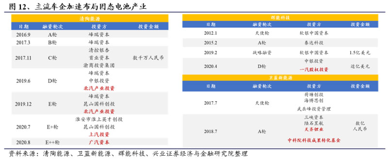 ?近兩年,北汽、上汽、廣汽均先后參與了清陶能源D/E/E+/E++輪融資。一汽在2020年參與了輝能科技的D輪融資。