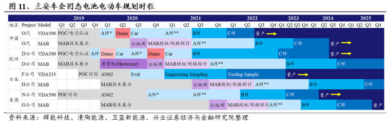 根據(jù)主要車企的規(guī)劃,搭載固態(tài)電池的產(chǎn)品預(yù)計(jì)最早于2022年以后量產(chǎn)。