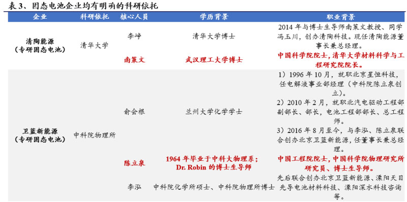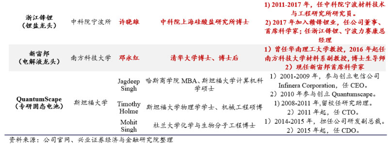 產(chǎn)-研融合屬性突出。清陶能源、衛(wèi)藍(lán)新能源、浙江鋒鋰、新宙邦、QuantumScape等企業(yè)的核心技術(shù)人員均來自清華大學(xué)、中科院、南科大、斯坦福等頂尖科研院所。
