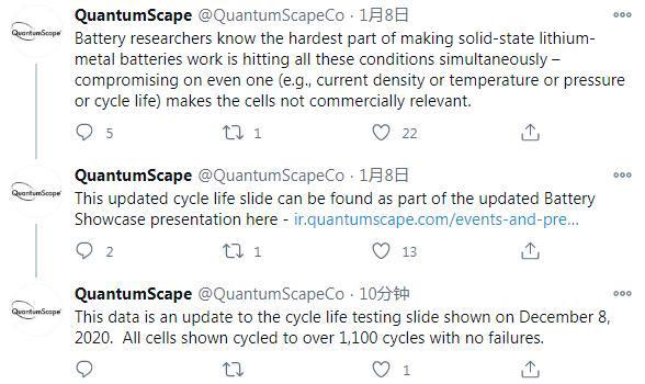 QuantumScape 剛剛宣布了正在測(cè)試的固態(tài)電池的另一項(xiàng)鼓舞人心的重要更新,由該公司在 Twitter 上披露的線索可知,QS 已經(jīng)完成了 1100 次循環(huán)測(cè)試。若以標(biāo)稱續(xù)航 300 英里(約 480 公里)的電池組為例,相當(dāng)于動(dòng)力電池可在生命周期內(nèi)行駛 30 萬(wàn)英里(約 48 萬(wàn)公里)。若換成標(biāo)稱續(xù)航 500 英里(約 800 公里)的電池組,則相當(dāng)于可行駛 50 萬(wàn)英里(約 80 萬(wàn)公里)。