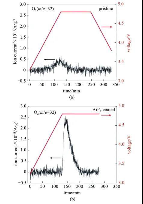 圖17 (a) 原始Li[Li0.2Mn0.54Ni0.13Co0.13]O2和(b)涂覆AlF3后的DEMS圖像