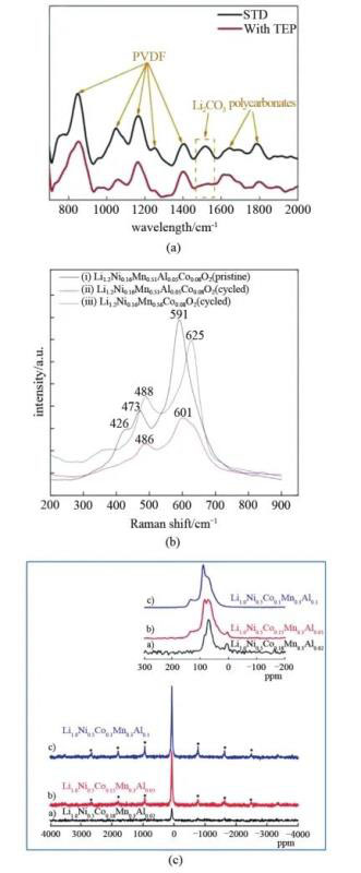 圖15 (a) LRO電極的FTIR圖像;(b) 循環(huán)前后對(duì)比的Li1.2Ni0.16Mn0.56Co0.08O2拉曼圖譜;(c) 鋁含量對(duì)NCM 523中鋁的局部結(jié)構(gòu)影響的NMR圖譜