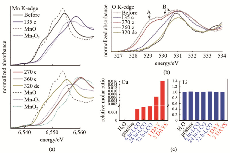 Wandt等用原位的XANES研究NCM為電池正極的鋰離子電池中的過(guò)渡金屬元素在工作時(shí)的溶解和沉積的問(wèn)題。當(dāng)電位超過(guò)4.6 V時(shí),Mn的溶解速率迅速增加。在原位觀察時(shí),無(wú)論充電狀態(tài)如何,石墨電極上沉積的Mn的價(jià)態(tài)始終為+2;然而同樣的電極之后再用非原位觀察卻發(fā)現(xiàn)了0價(jià)Mn的存在。說(shuō)明即使在氬氣填充的手套箱中Mn2+還是不可避免地被還原了。