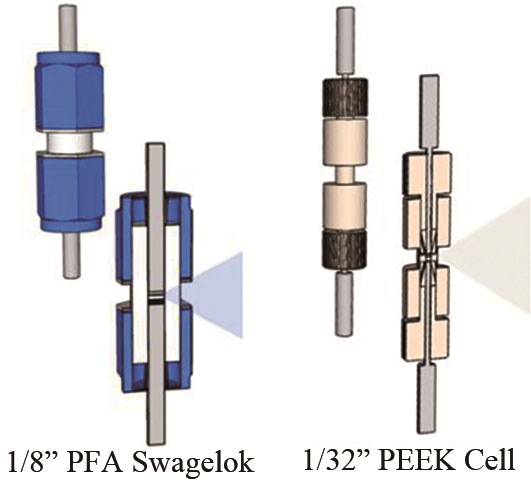 Raman散射常使用激光光源,為保證原位觀測(cè)窗口的穩(wěn)定,其材料多為耐熱玻璃或石英。FTIR有兩種主要的電池設(shè)計(jì),分別是具有內(nèi)部(電解質(zhì)層較厚)和外部(電解質(zhì)層較薄)反射配置的單元。