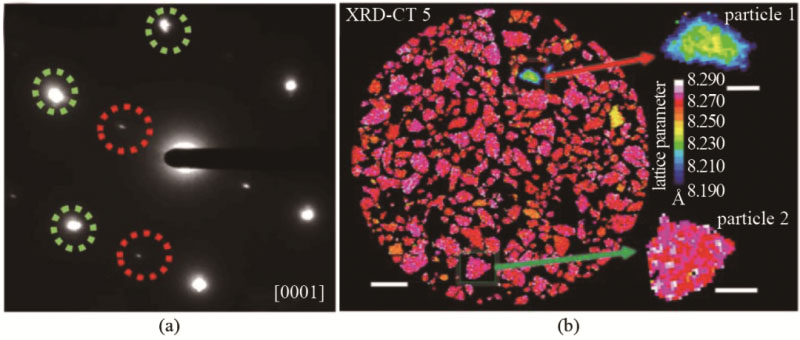 圖10 (a) TiO2包覆后NCM的電子衍射圖像;(b) XRD-CT分析LixMn2O4圖像,粒子的異質(zhì)性