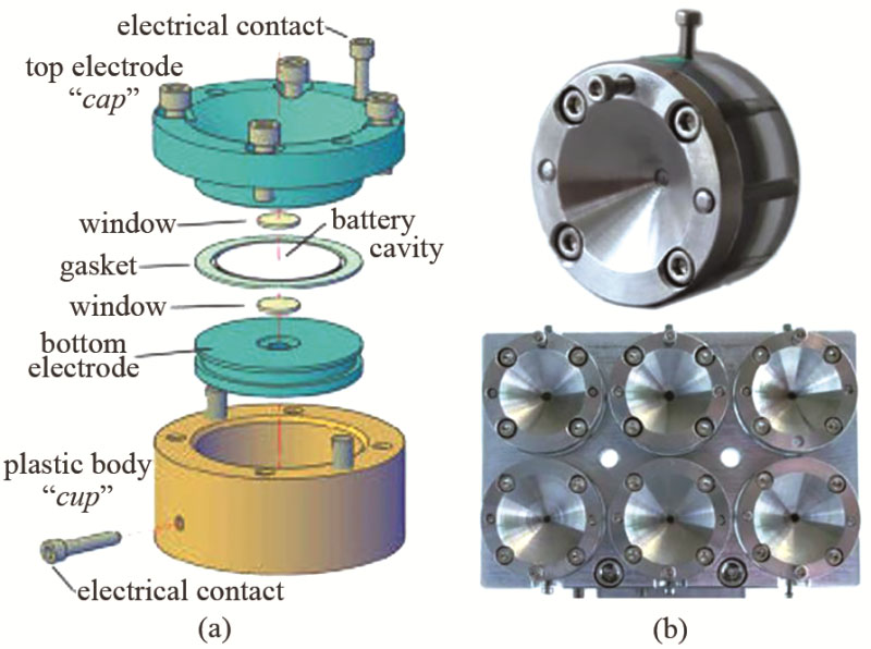 對(duì)原位X射線檢測(cè)技術(shù)而言,實(shí)驗(yàn)用的電池需要一個(gè)窗口使X射線通過(guò),這就需要特殊構(gòu)型的電池。但電池設(shè)計(jì)考慮表征時(shí)也要盡可能減少對(duì)電池反應(yīng)的不利影響,電池堆疊不緊密或者窗口透射X射線導(dǎo)致電導(dǎo)率差都會(huì)影響電池反應(yīng)。阿貢國(guó)家實(shí)驗(yàn)室的Borkiewicz等設(shè)計(jì)了一種AMPIX電池(圖8),能在不影響電池運(yùn)行的情況下允許多種X射線表征,包括XRD和XAS等表征技術(shù)。電池裝置幾個(gè)主要部件包括杯形主體、位于頂部和底部電極、X射線窗口和一個(gè)扁平的環(huán)形墊圈。