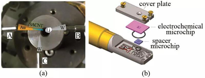 圖4 (a) SEM原位電池裝置示例;(b) TEM原位電池裝置