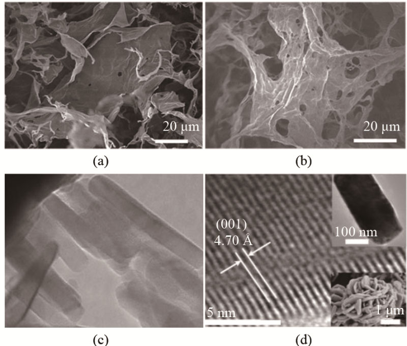 圖3 球磨GO的SEM圖像,球質(zhì)比為:(a) 0.6;(b) 1.2;(c) LiMnPO4的TEM;(d) NCM-H的HRTEM