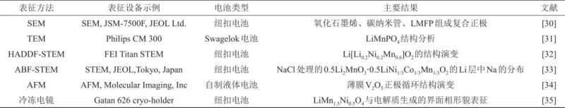 在對(duì)鋰離子電池的正極材料的研究中,顯微成像方法主要被用于觀察正極脫嵌鋰前后、循環(huán)過(guò)程中和包覆以及摻雜帶來(lái)的形貌以及微觀結(jié)構(gòu)的變化。研究中主要使用的顯微成像方法有SEM、TEM、STEM、STM、AFM、掃描透射X射線顯微鏡(STXM)以及同步透射X射線顯微鏡(TXM)。表1列舉了近年一些研究中的顯微成像表征工作。