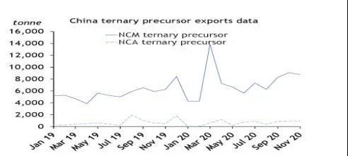 中國(guó)海關(guān)數(shù)據(jù)顯示,2020年1-11月國(guó)內(nèi)NCM三元前驅(qū)體出口達(dá)81649噸,同比增長(zhǎng)37.2%;同期NCA前驅(qū)體的出口量增長(zhǎng)了1.4%,達(dá)到6868噸。