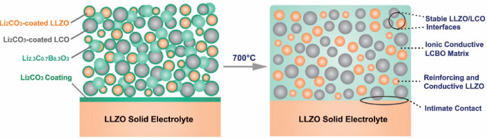 在正極材料中混入低熔點(diǎn)離子導(dǎo)體,通過(guò)施加高于 離子導(dǎo)體熔點(diǎn)的溫度使離子導(dǎo)體融化后冷卻,均勻分布在正極材料與固態(tài)電解質(zhì)之間,這種方法不僅可以避免正極材料與固態(tài)電解質(zhì)接觸發(fā)生反應(yīng)。而且可以提高正極材料與固態(tài)電解質(zhì)之間的接觸面積, 還能改善因正極顆粒在充放電時(shí)發(fā)生破碎而導(dǎo)致的接觸不良的問(wèn)題。Han等在LCO和 LLZO界面處加入低熔點(diǎn)的LCBO,如圖6所示。LCBO使LCO與固態(tài)電解質(zhì)的接觸面積增大,同時(shí)減小了LCO在充放電過(guò)程中因體積變化導(dǎo)致的顆粒破碎對(duì)正極材料與導(dǎo)電劑之間接觸性能的影響。另外,利用LCBO隔絕LCO與LLZO,避免了兩者之間在充放電過(guò)程中發(fā)生反應(yīng)。3方面共同作用,提升了LCO/LLZO/Li全固態(tài)鋰離子電池的電化學(xué)性能,然而,該方法的制備工藝非常復(fù)雜,成本較高。