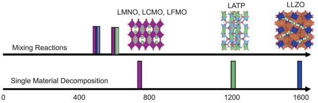 圖4 不同尖晶石型正極材料與LATP, LLZO固態(tài)電解質(zhì)的分解溫度以及兩兩混合后的分解溫度示意圖