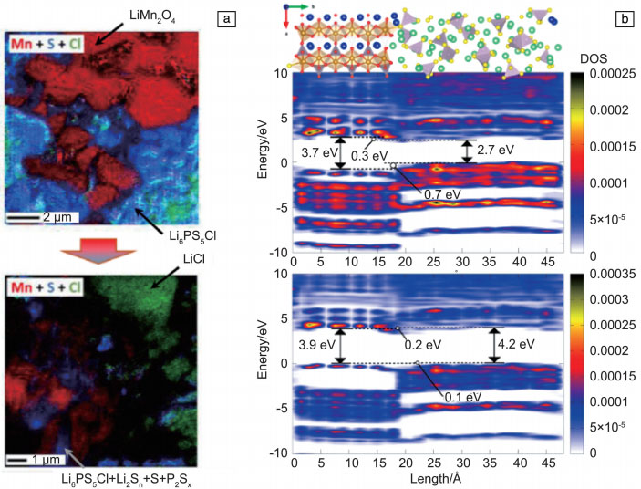 圖2 LMO/LPSC/ Li-In全固態(tài)電池正極側(cè)循環(huán)前(上) 和循環(huán)后(下) 的SAM圖譜(a) ;LPS/LFP界面的電子層狀態(tài)密度 (LDOS)等高線圖(利用+U能級(jí)計(jì)算得到的結(jié)果(上), 利用HSE06雜化泛函能級(jí)計(jì)算得到的結(jié)果(下))(b)
