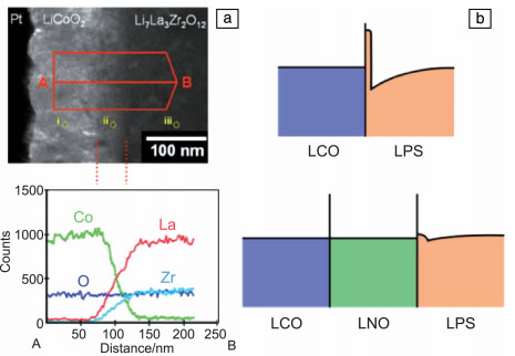 正極材料間元素的相互擴(kuò)散通常發(fā)生在氧化物陶瓷固態(tài)電解質(zhì)和氧化物正極材料之間的界面上。Kim等利用TEM和線性EDS發(fā)現(xiàn)LLZO與LCO的界面在室溫下存在50~100nm的元素?cái)U(kuò)散層,如圖1a所示,其主要成分為L(zhǎng)a2CoO4。但是,由于在室溫下正極材料間元素相互擴(kuò)散的速度極慢,所以很難對(duì)該擴(kuò)散過(guò)程生成的產(chǎn)物進(jìn)行表征。